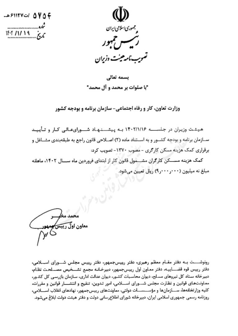 معاون اول رئیسجمهور مصوبه مربوط به تعیین کمک هزینه مسکن کارگران مشمول قانون کار در سال ۱۴۰۲ را ابلاغ کرد.